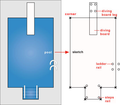 On your sketch, put an X at every corner point. Note any diving boards, legs or rails with circles.