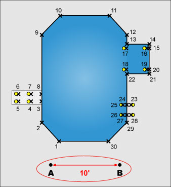 Using masking tape, put two points several feet from the pool edge, exactly 10 feet apart from one another. Mark each point with masking tape. Label one A and the other B.