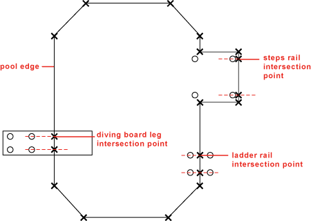 Also put an X for intersection points other than corners.These points occur at the pool edge wherever legs or rails face the pool edge.