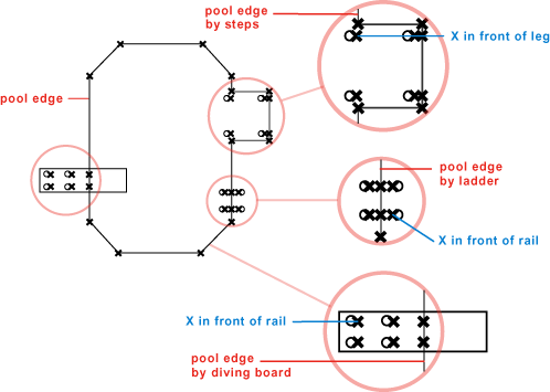 Put an X at every leg or rail where it faces the pool edge.
