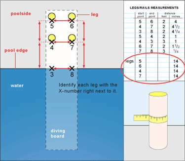 Lazy-L. (12) Measuring Legs and Rails. Measure distances between legs (or rails) and between each leg and the pool edge. Always measure from point to point (X to X). Also measure the distance around each leg (circumference) Write all measurements on the Legs/Rails Measurements page. | ||||||||