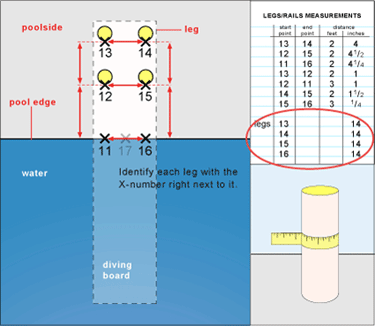 | Oval. (12) Measuring Legs and Rails. Measure distances between legs (or rails) and between each leg and the pool edge. Always measure from point to point (X to X). Also measure the distance around each leg (circumference) Write all measurements on the Legs/Rails Measurements page. | ||||||||