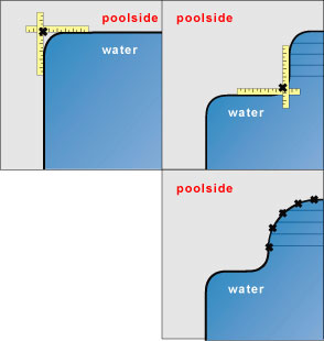 Marking a point at a corner requires the use of two yardsticks. If your pool has curved steps, put an X every 12 inches or so.