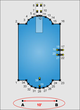 Using masking tape, put two points several feet from the pool edge, exactly 10 feet apart from one another. Mark each point with masking tape. Label one A and the other B.