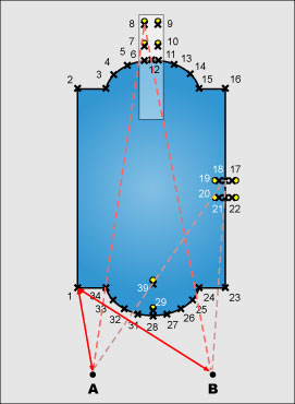 Measure from A to 1 and from B to 1, then from A to 2 and B to 2, and so on. Write the measurements on the A-B Measurements page.