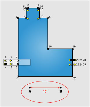 Using masking tape, put two points several feet from the pool edge, exactly 10 feet apart from one another. Mark each point with masking tape. Label one A and the other B.