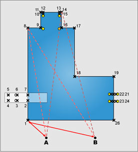 Measure from A to 1 and from B to 1, then from A to 2 and B to 2, and so on. Write the measurements on the A-B Measurements page.