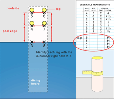 | True-L. (11) Measuring Legs and Rails. Measure distances between legs (or rails) and between each leg and the pool edge. Always measure from point to point (X to X). Also measure the distance around each leg (circumference) Write all measurements on the Legs/Rails Measurements page. | ||||||||